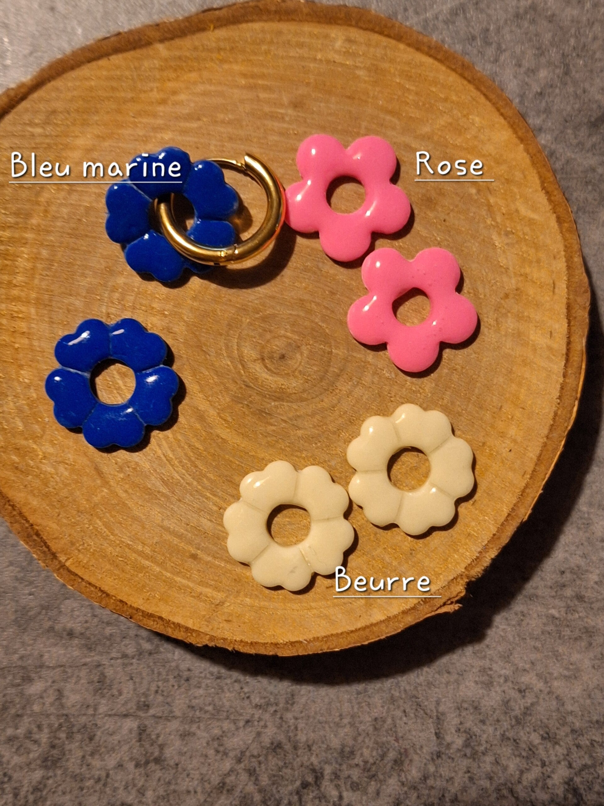 Lot de trois pampilles en polymére,avec une paire de créole doré ou argenté ( Couleurs:Bleu marine/ Beurre/ Rose )