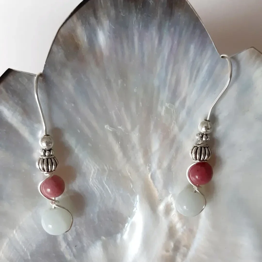 Boucle d'oreille acier inoxydable argenté/ perle quartz blanc et rhodochronite 8/6 mm