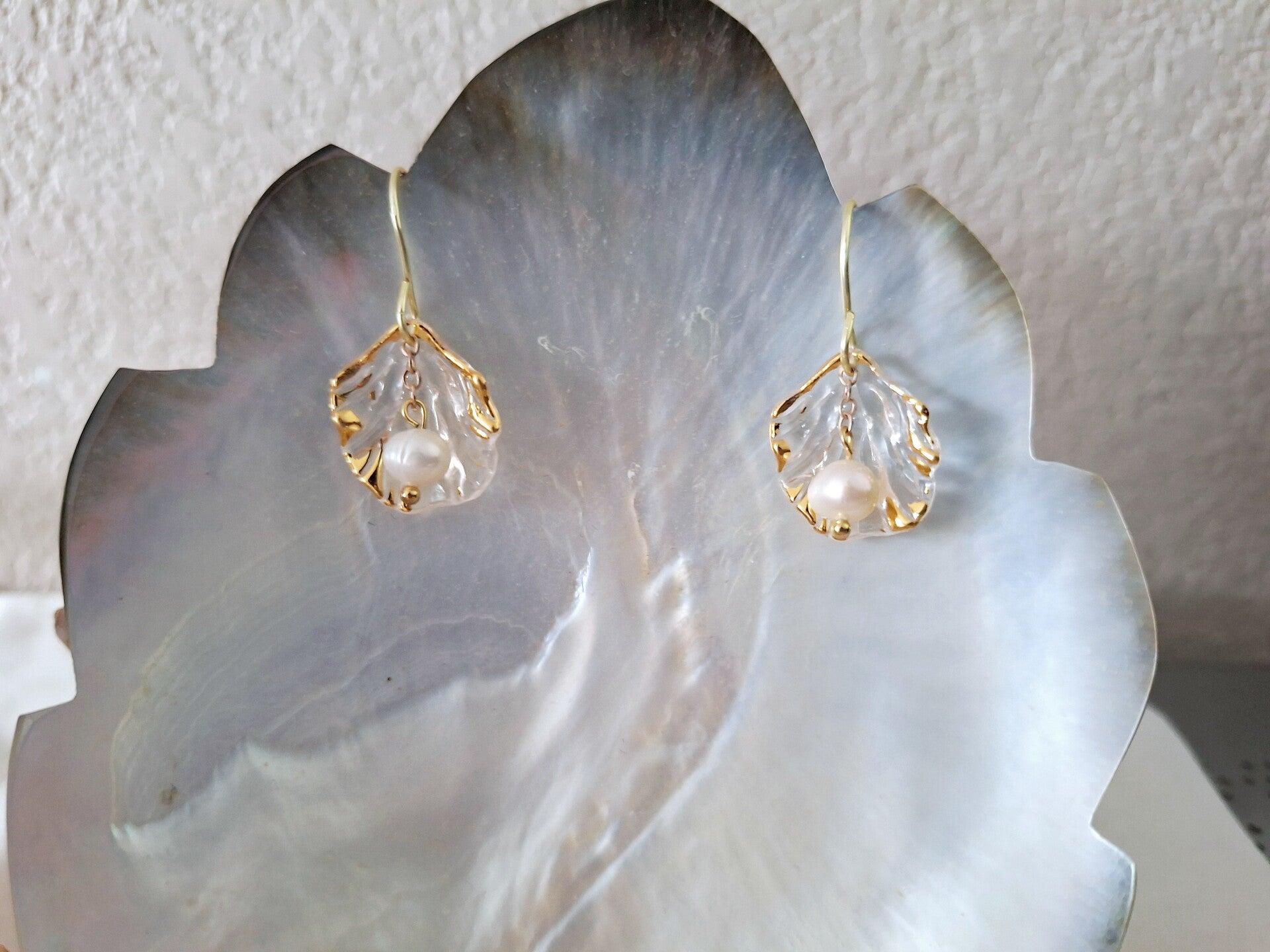 Collier, boucle d'oreille inoxydable, chirugical doré /Perles eau douce 4/6mm/ coquillage 2cm